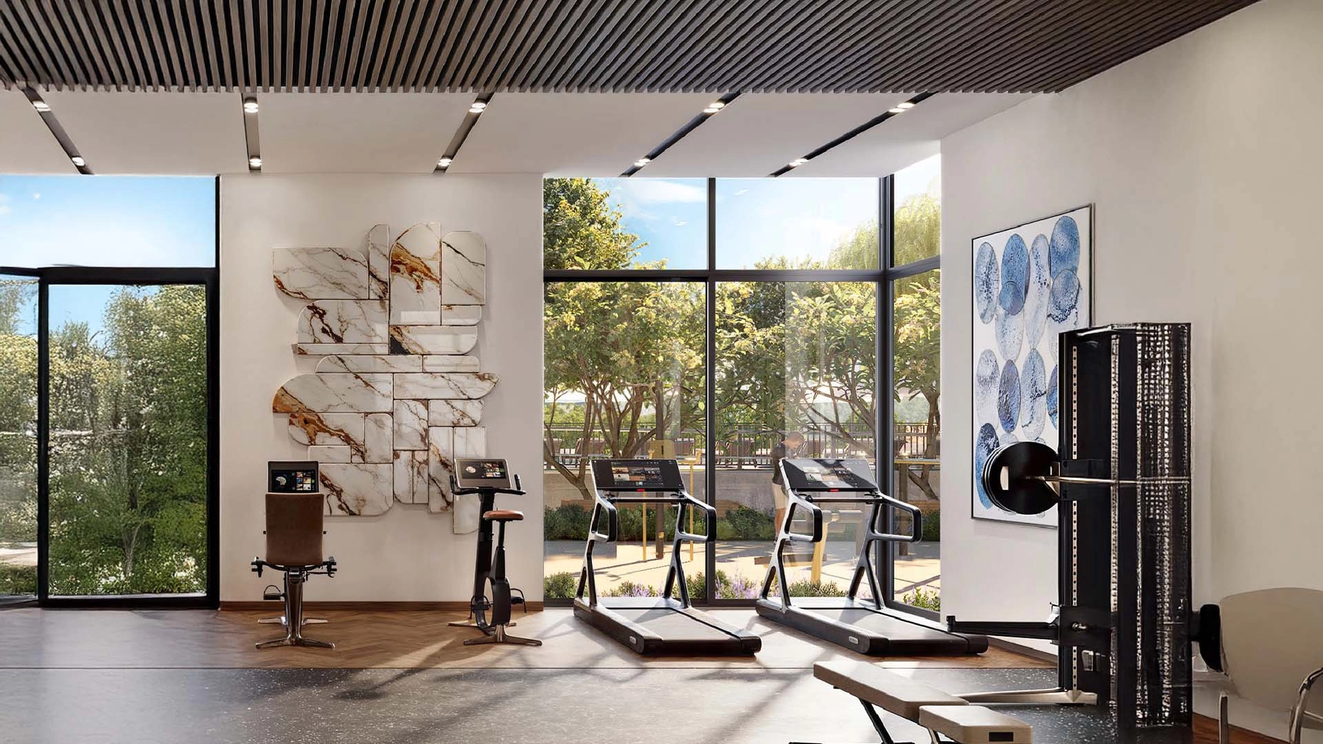 Stone bands, timber accents, and wide windows create a modern aesthetic. Balconies, shaded rooftops, and landscaped ledges enhance cooling and frame views of the park or skyline.