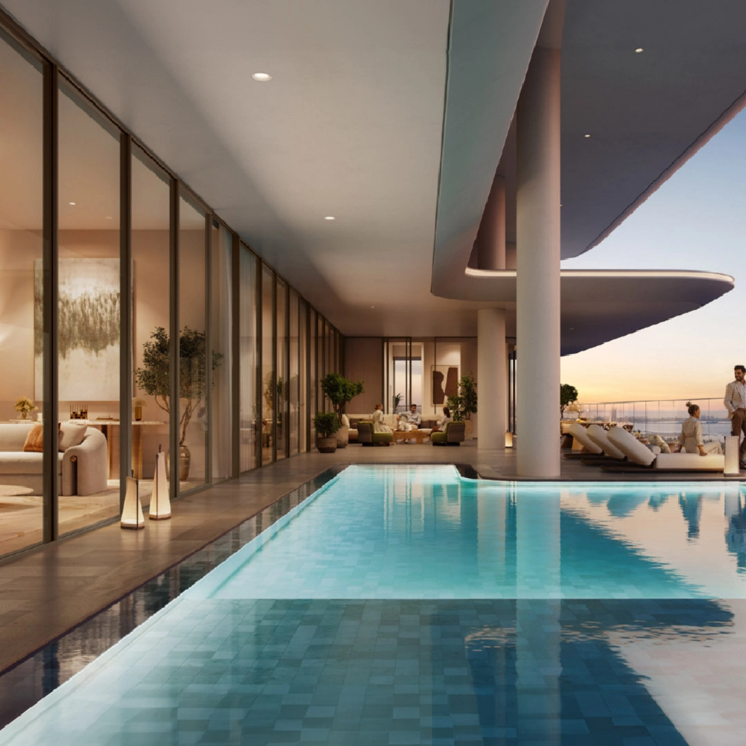 The building’s contemporary design blends expansive glass with warm, premium materials, allowing light and views to flow effortlessly through each space. Clean lines and thoughtful proportions create a timeless presence, where modern sophistication meets understated Palace elegance.