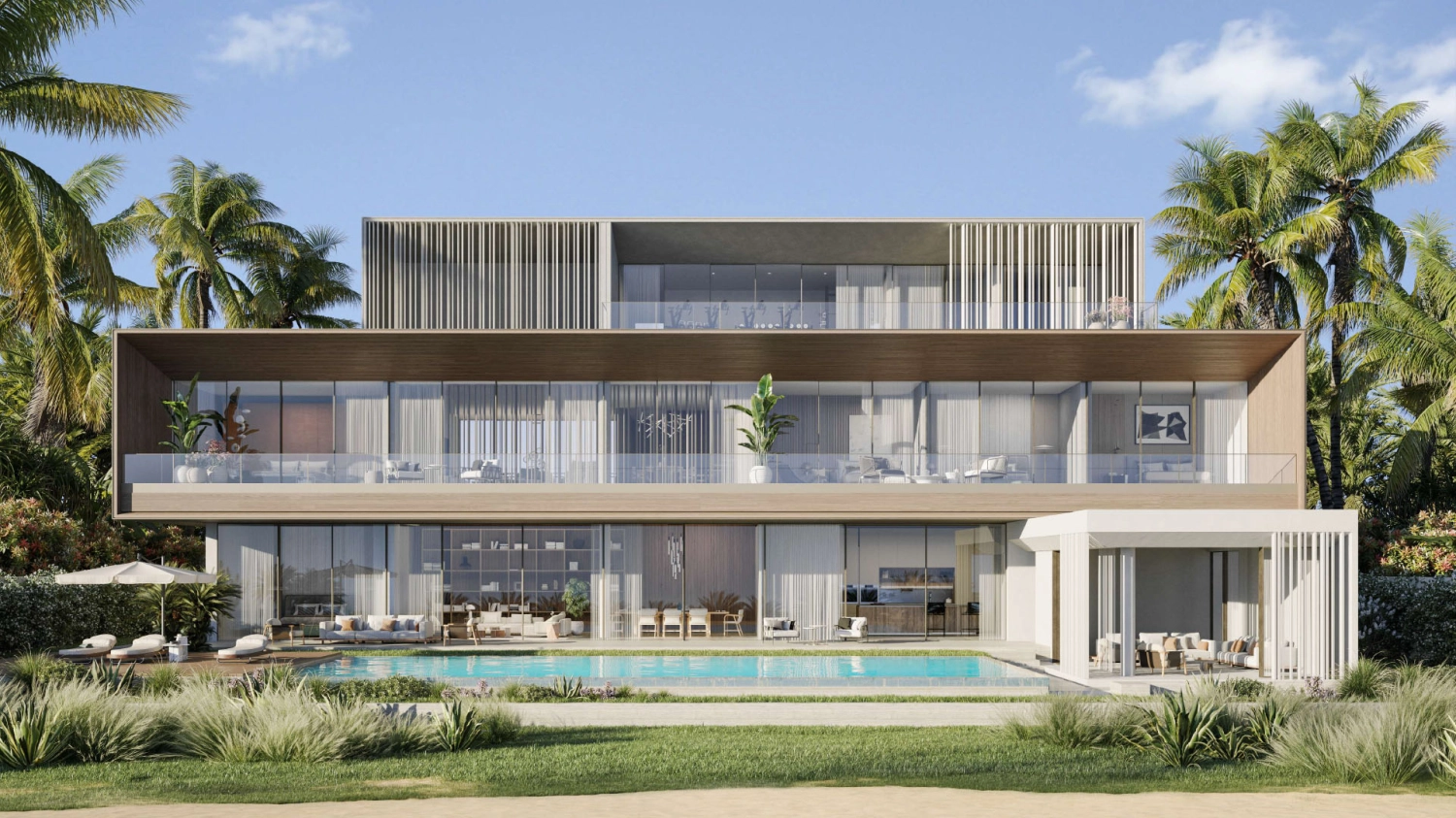 The villas are designed as true beachfront homes, not just houses near the water. Six-bedroom layouts open into spacious living areas, large terraces, and seamless indoor-outdoor connections. Inside, the mood is warm and relaxed, guided by a “barefoot luxury” approach that favors natural materials, soft tones, and quality finishes chosen for everyday living. Light flows through the spaces, and the sea is never far from view making each home feel calm, private, and effortlessly elegant.