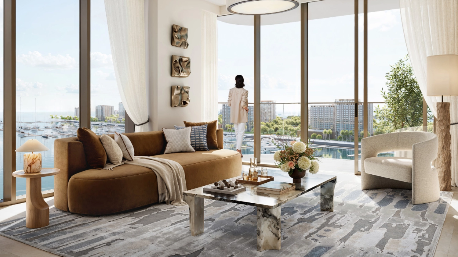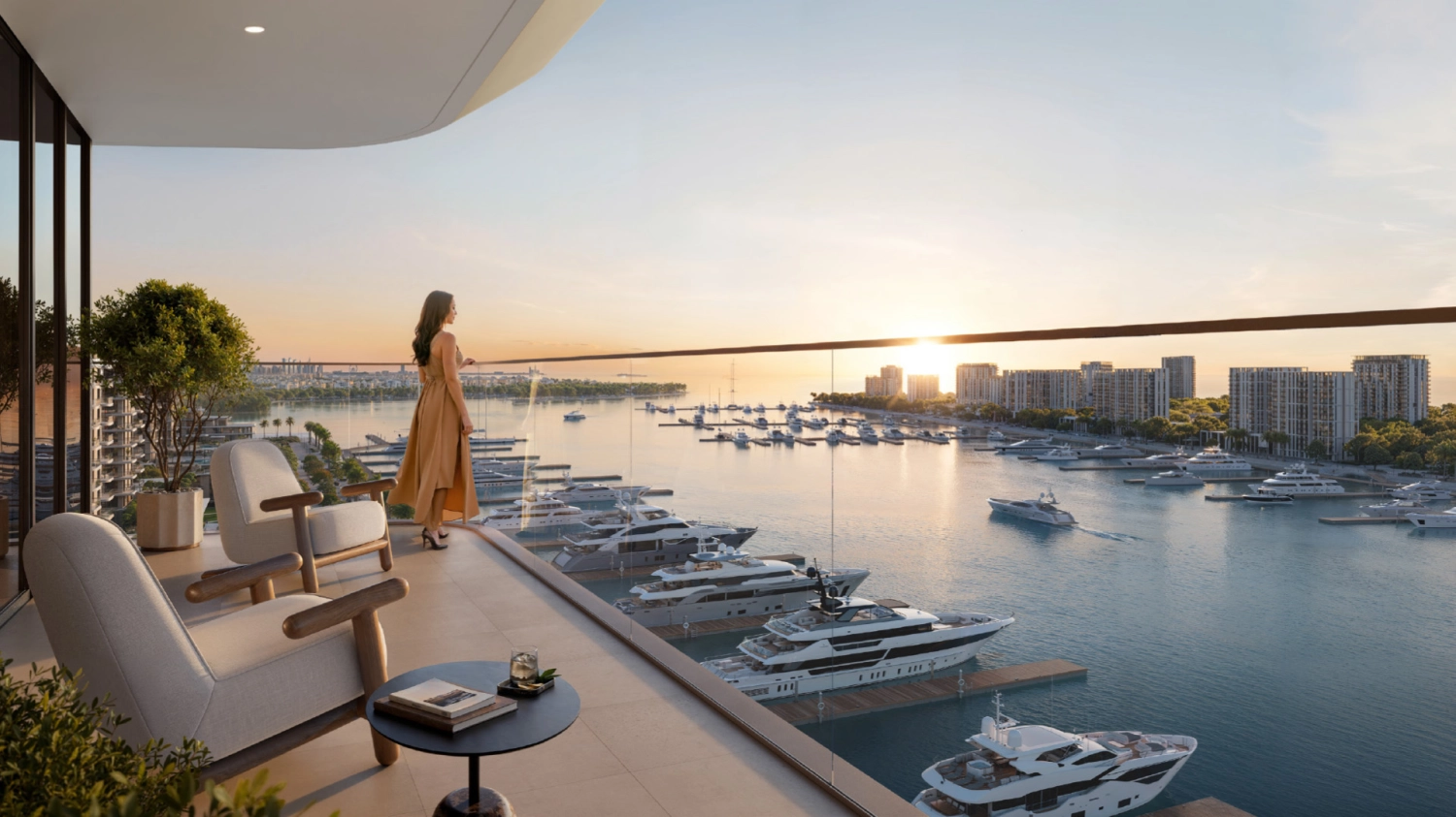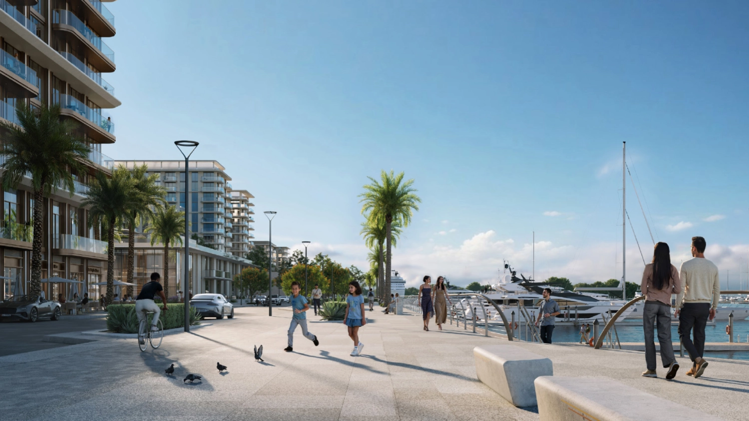 The development features two elegant mid-rise towers rising along the promenade, designed to frame sweeping marina and skyline views. Homes range from intimate one-bedroom residences to majestic four-bedroom apartments, each carefully planned to invite natural light and uninterrupted vistas into everyday living.