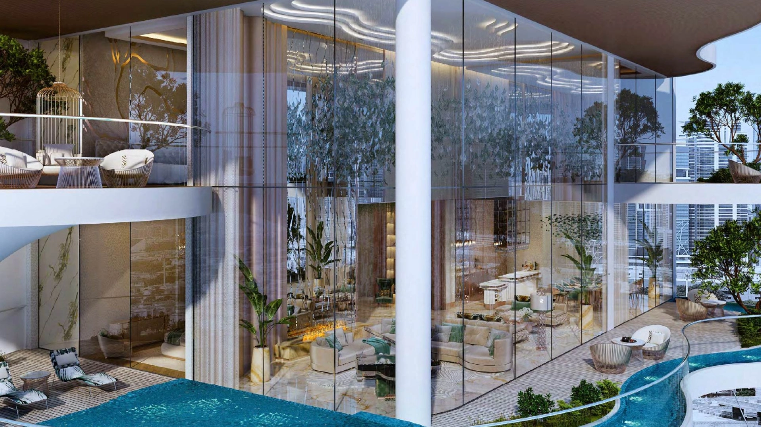 The lobby features a striking triple-height design that opens up to an indoor lagoon, a luxury spa, an aqua gym, a yoga studio, and a fish-pedicure retreat. Outside, residents can relax at a podium beach, enjoy the lazy river, and let kids have fun in the splash zone. Additional amenities include private gardens, concierge and valet services, and chef and housekeeping services, transforming everyday living into a five-star resort experience.