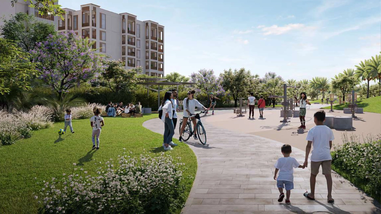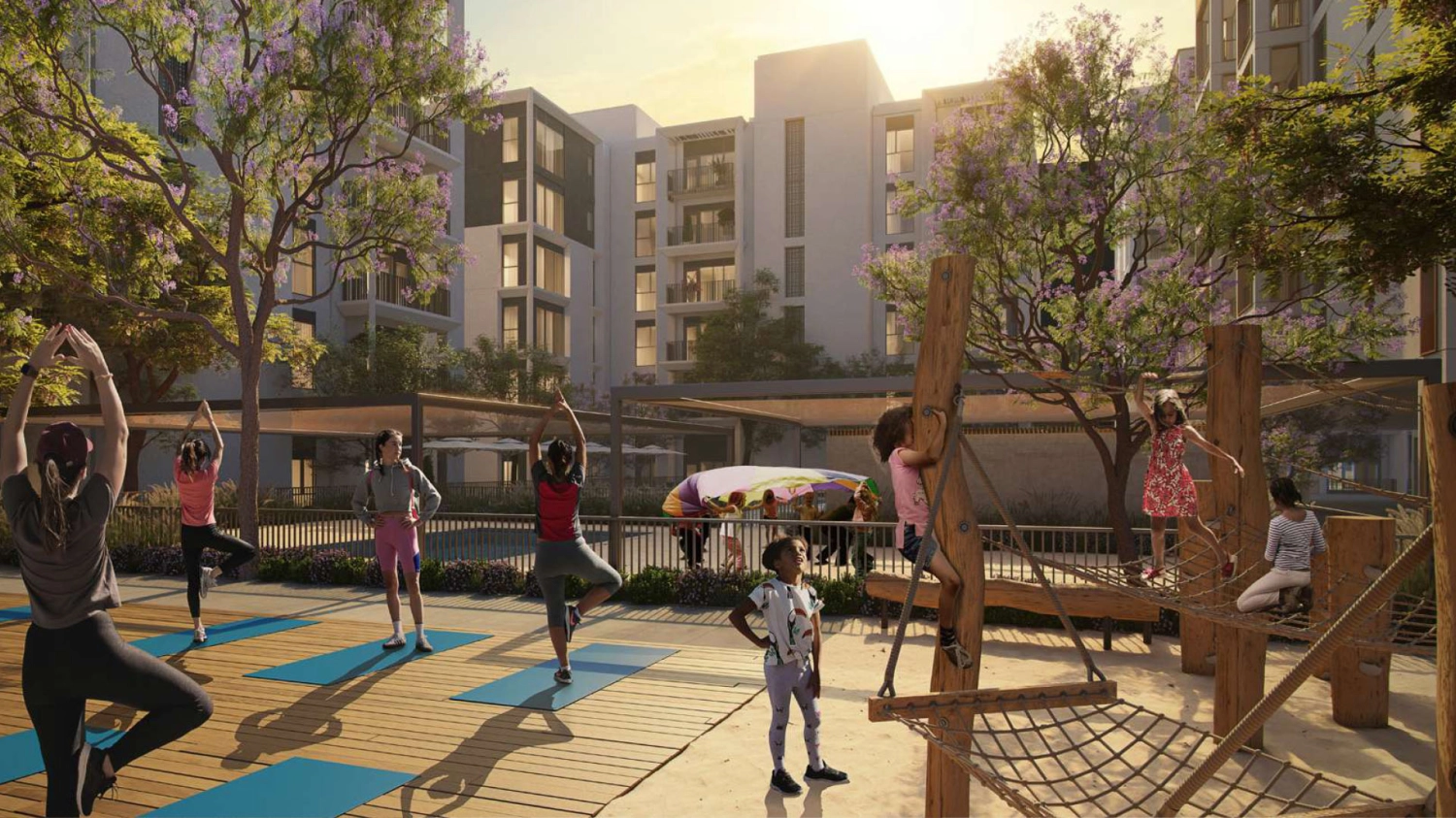 The development features a refined collection of 1- to 3-bedroom apartments arranged across four elegant residential buildings that embrace a vibrant central plaza. Every home is designed to capture natural light and calming views of green courtyards and open spaces, creating a lifestyle that feels relaxed yet connected.