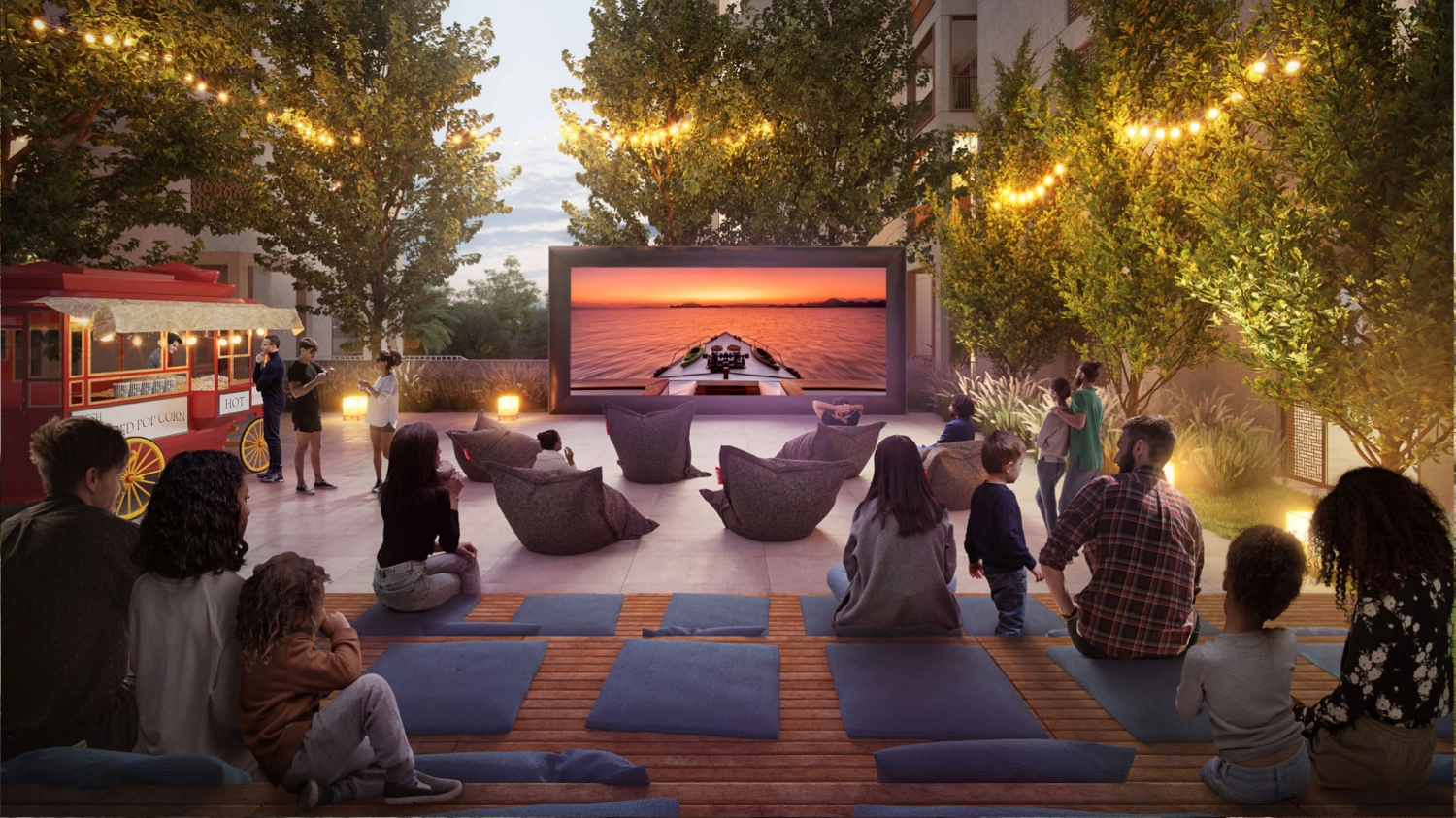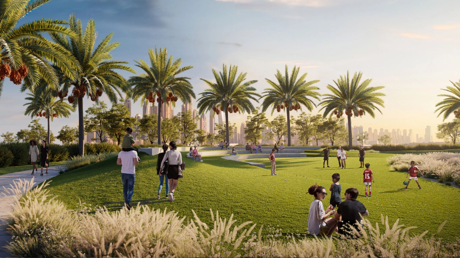 The architecture is refined and welcoming, forming a central residential plaza that feels lively yet relaxed. Landscaped walkways, shaded seating areas, and open lawns shape an environment that encourages walking, gathering, and enjoying the rhythm of daily life.