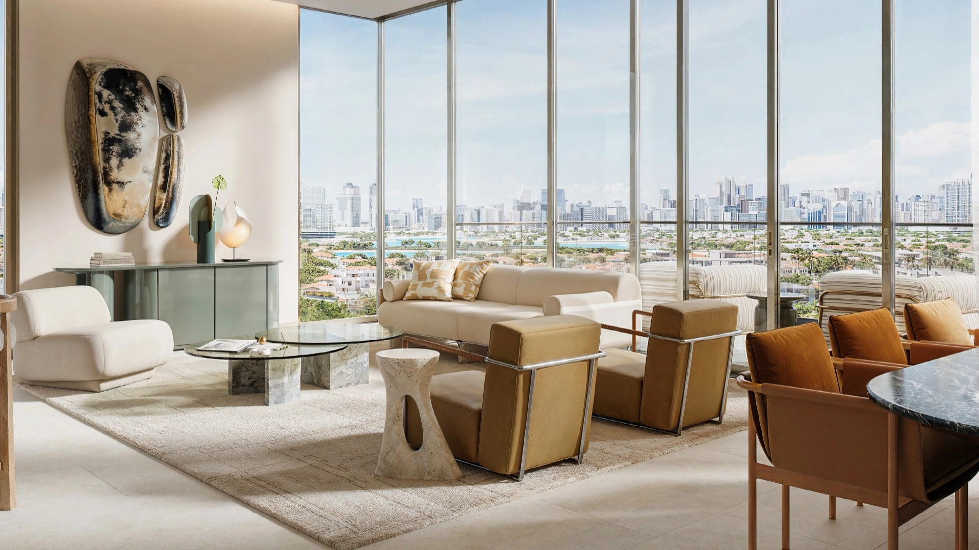 The towers are designed with warm stone and glass layers that provide each balcony with views of the water, park, or skyline. Ground-level terraces and shaded colonnades create a beach-style atmosphere that seamlessly connects the homes to the lagoon.
