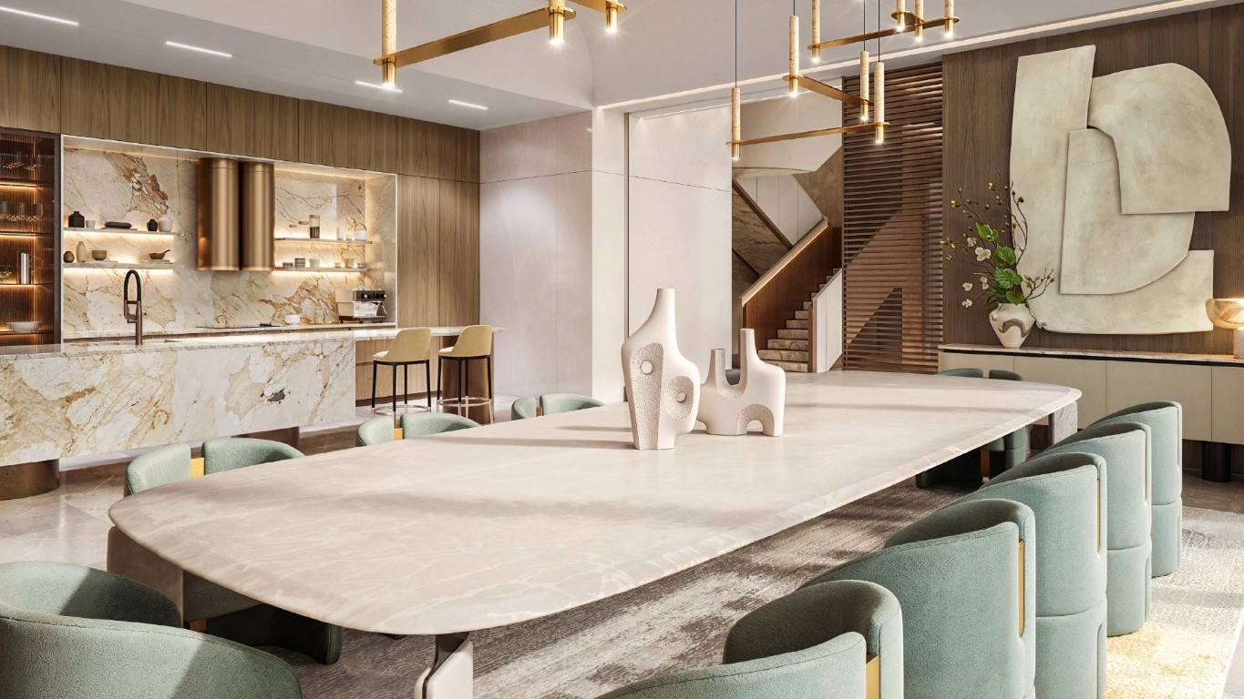 One-bedroom apartments start at about 740 square feet and can exceed 4,500 square feet for four-bedroom units, topped by a five-bedroom penthouse. Open kitchens connect to bright living rooms that lead to spacious terraces, while larger homes offer smart controls, built-in storage, and maid's rooms.