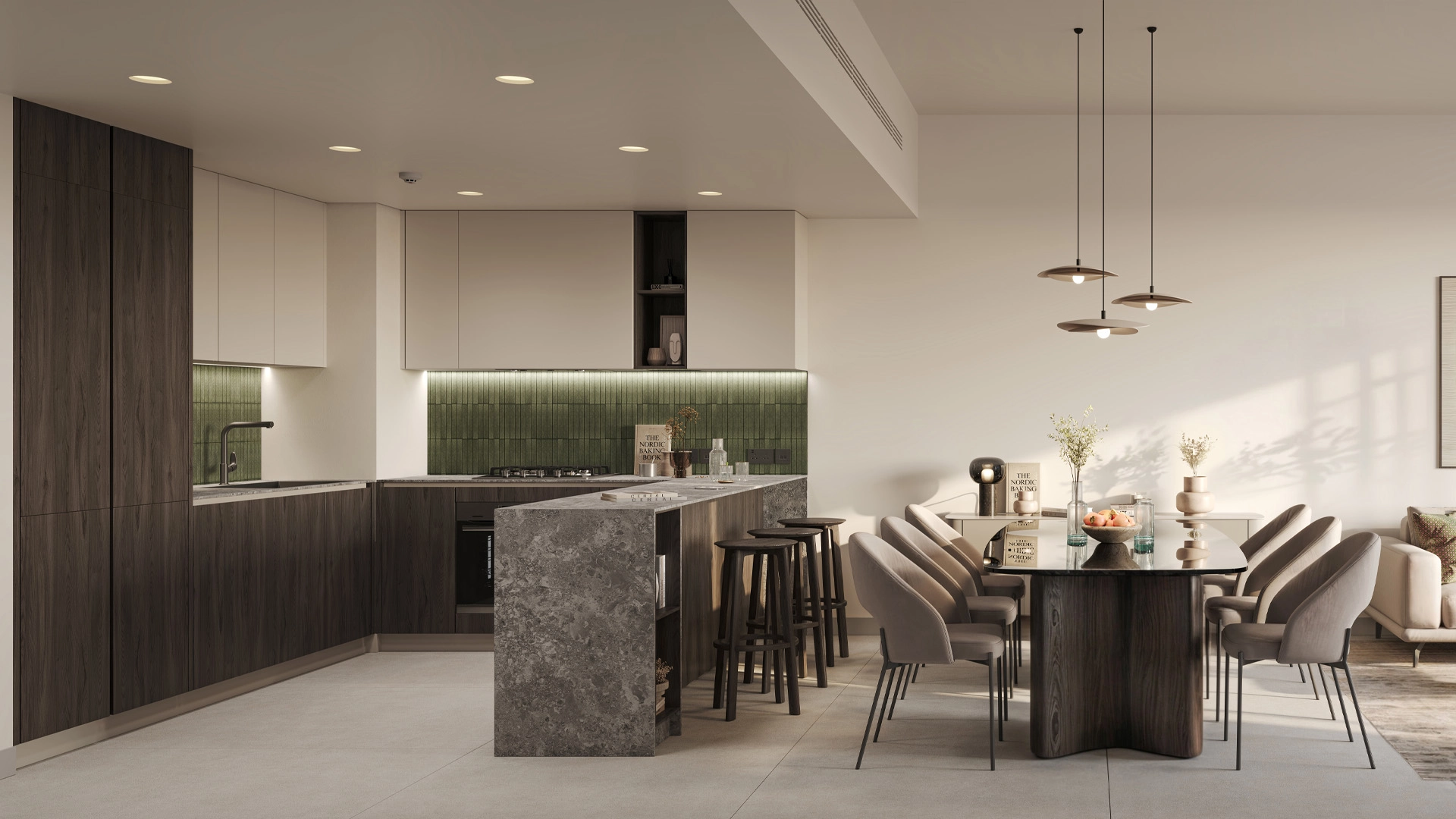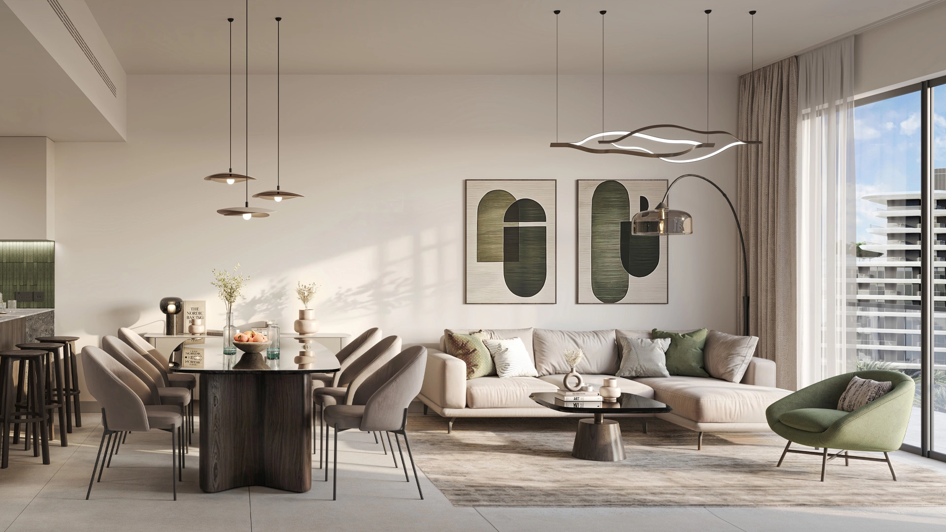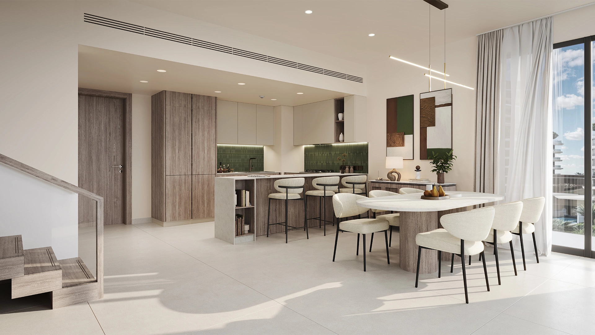 Exteriors showcase clean horizontal lines in pale stone and glass, accented by green balcony planters. Deep overhangs minimize glare, while soft night lighting casts a calming glow along the pathways.
