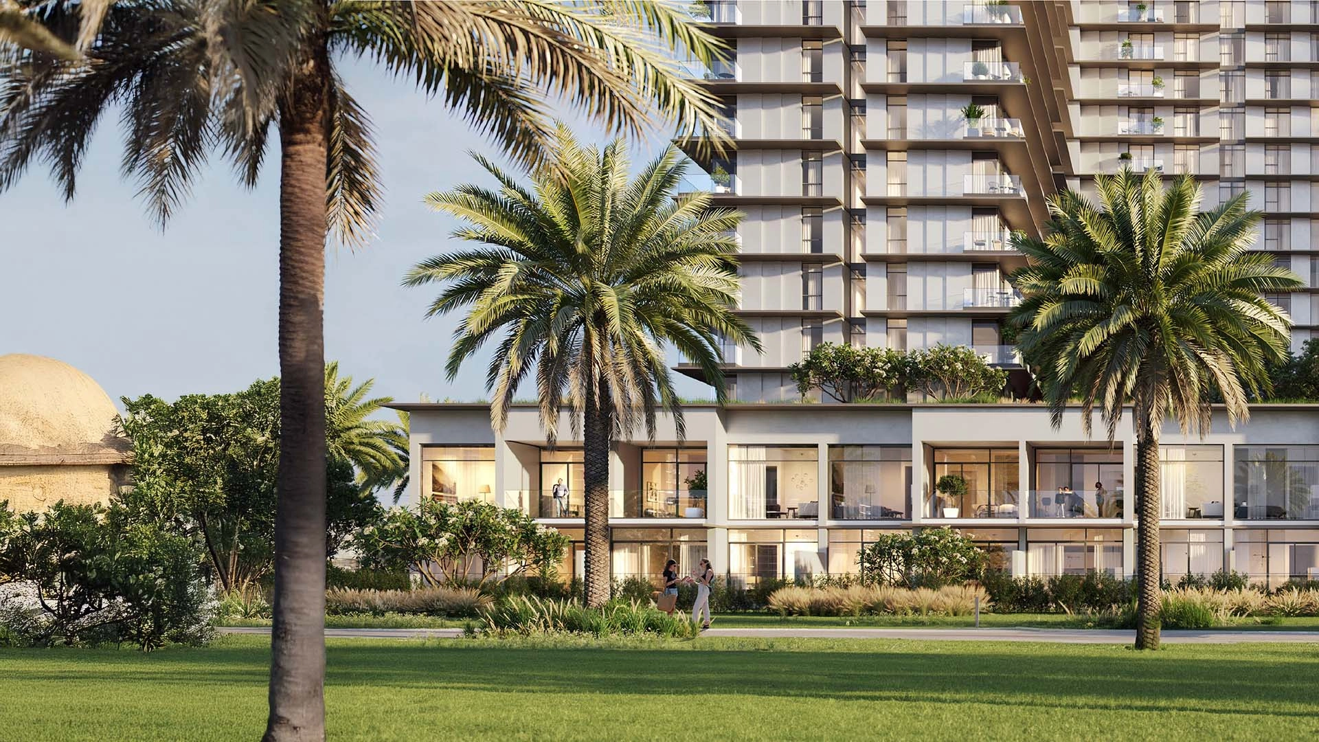 Stone bands, timber accents, and wide windows create a modern aesthetic. Balconies, shaded rooftops, and landscaped ledges enhance cooling and frame views of the park or skyline.