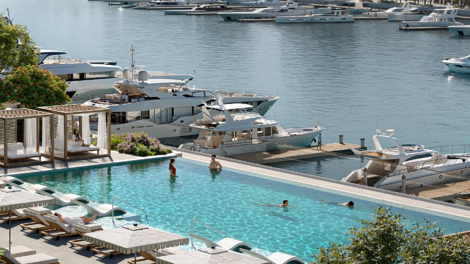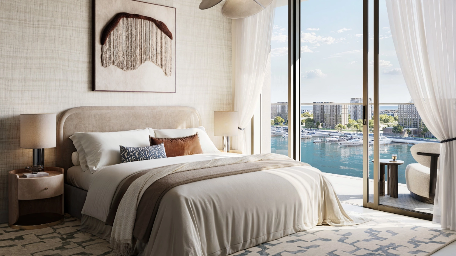 The development features two elegant mid-rise towers rising along the promenade, designed to frame sweeping marina and skyline views. Homes range from intimate one-bedroom residences to majestic four-bedroom apartments, each carefully planned to invite natural light and uninterrupted vistas into everyday living.