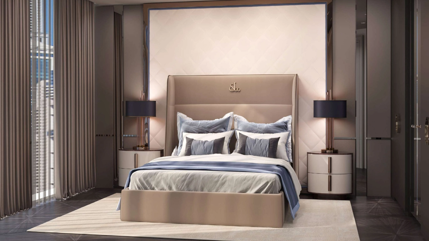 The exterior features a distinctive diamond crown by Jacob & Co., along with sleek aluminum fins, clear glass, and warm bronze panels that reflect sunlight by day and glow at night. Thoughtful elements such as spacious terraces, energy-saving solar screens, and green roofs contribute to a comfortable, eco-minded environment.