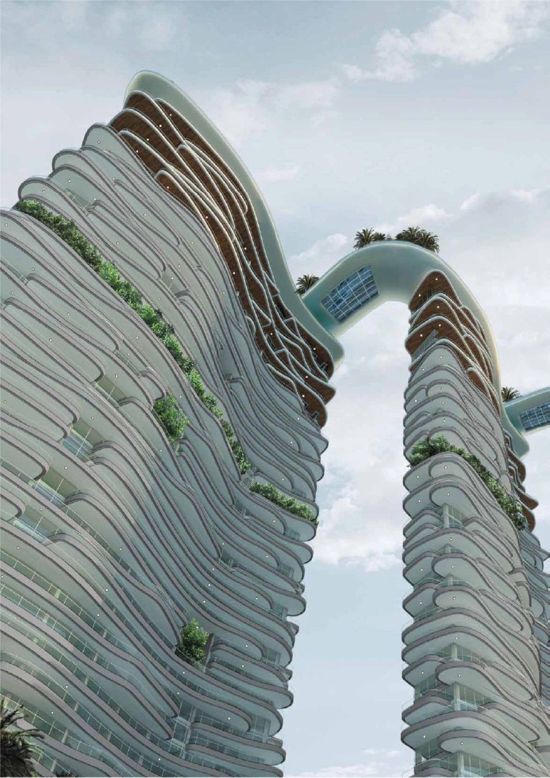 Three wave-shaped towers rise 42 stories on a private stretch of Dubai Harbour. The homes overlook the marina, the open Gulf, and the Palm skyline, while a sky-bridge podium links amenities above the water for a low-density, resort-like calm.