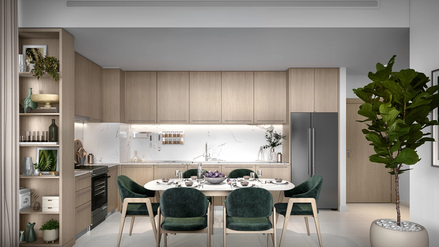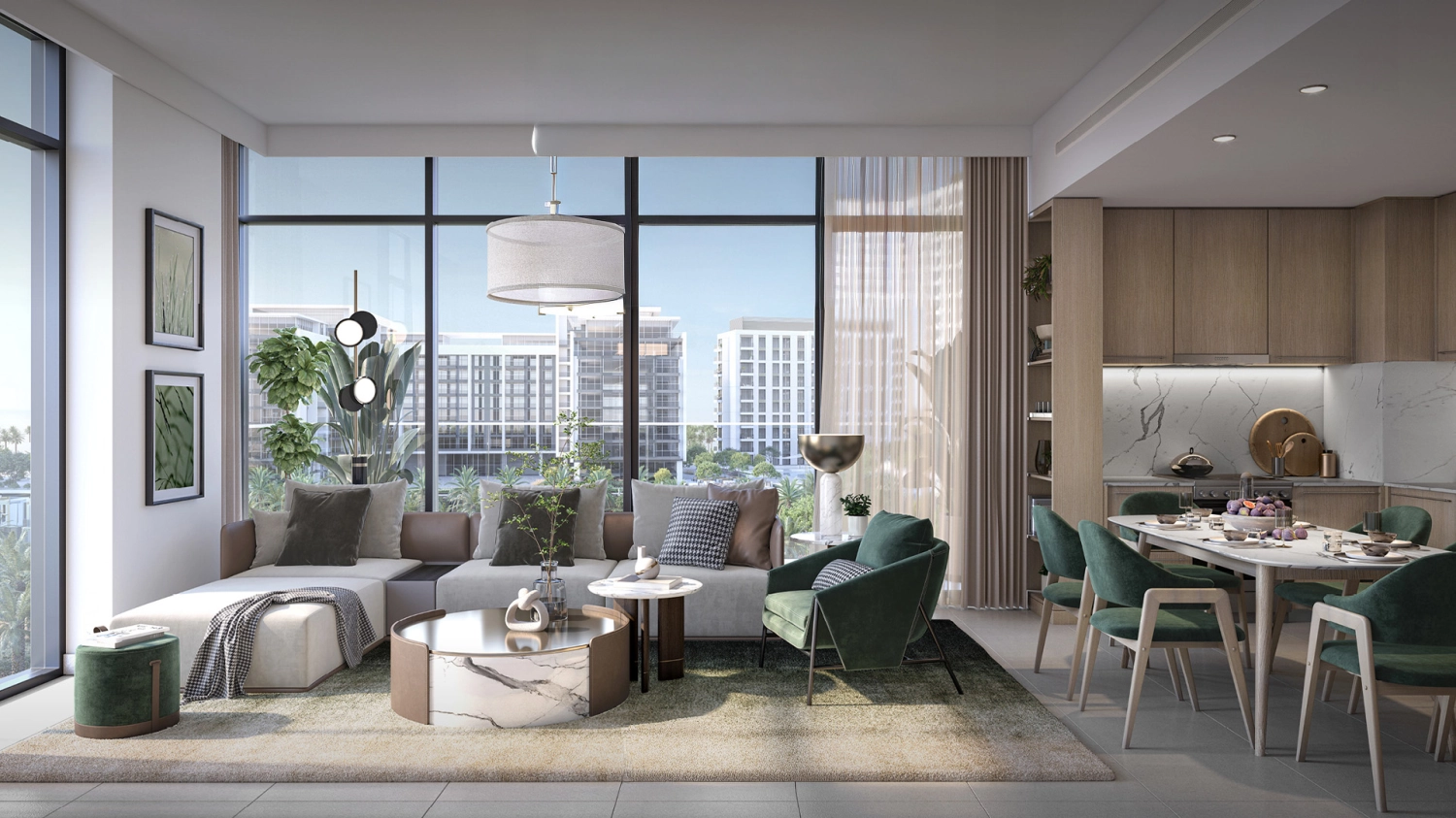 The project presents an exclusive range of one- to three-bedroom apartments, complemented by three-bedroom townhouses and duplex residences with expansive terraces. Each home is thoughtfully designed with floor-to-ceiling glazing, open living spaces, and wide balconies that capture views of lush parklands and the surrounding skyline.