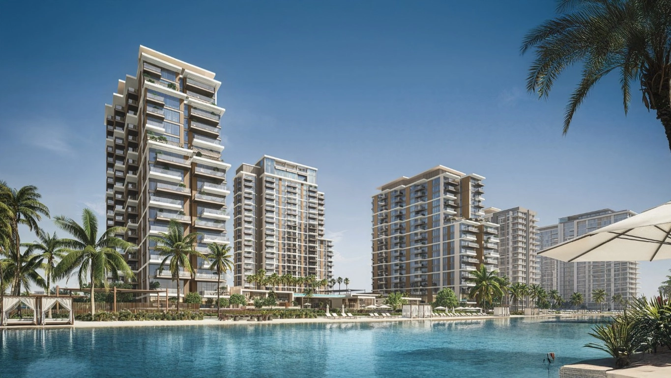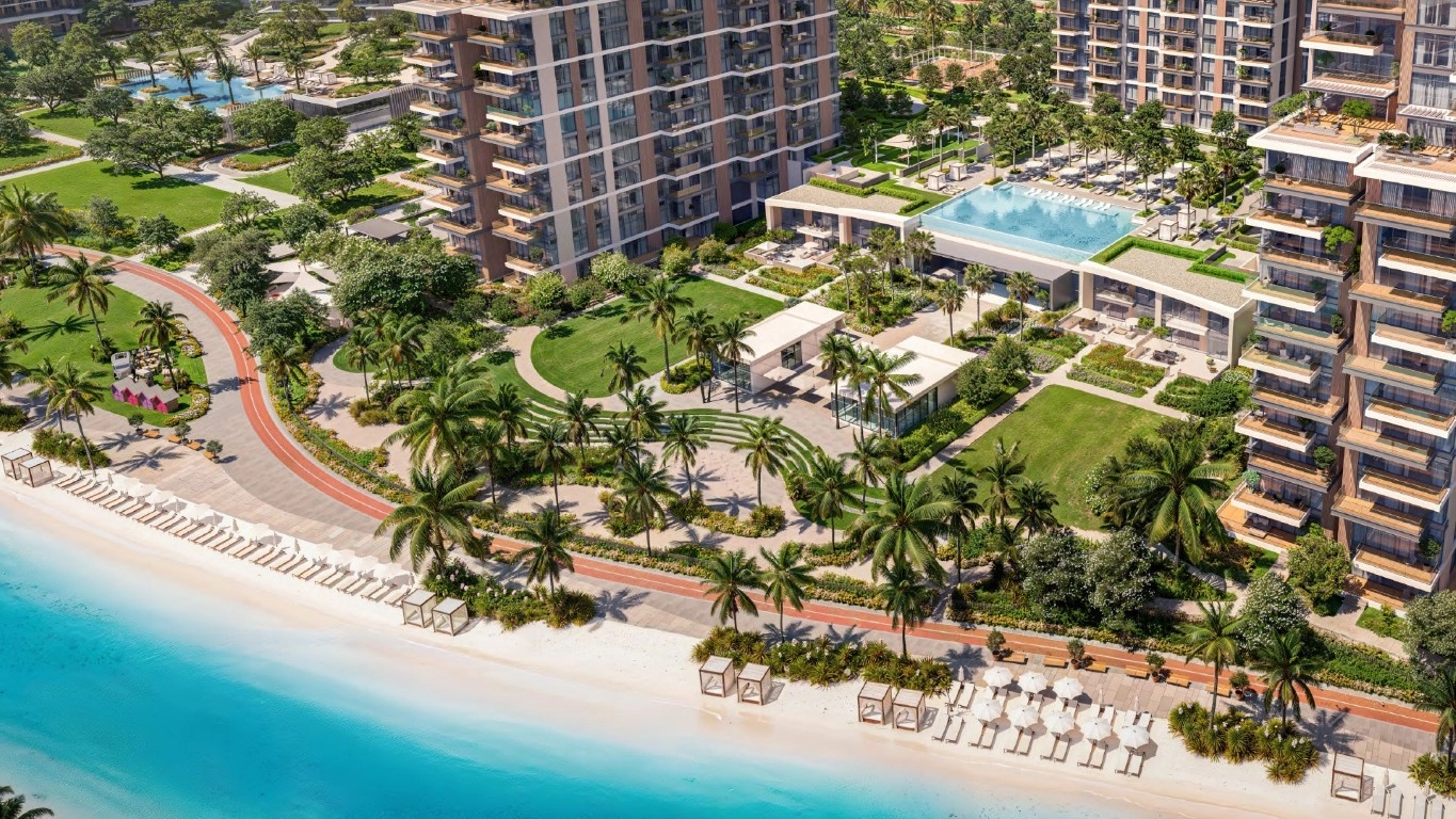 The towers are designed with warm stone and glass layers that provide each balcony with views of the water, park, or skyline. Ground-level terraces and shaded colonnades create a beach-style atmosphere that seamlessly connects the homes to the lagoon.