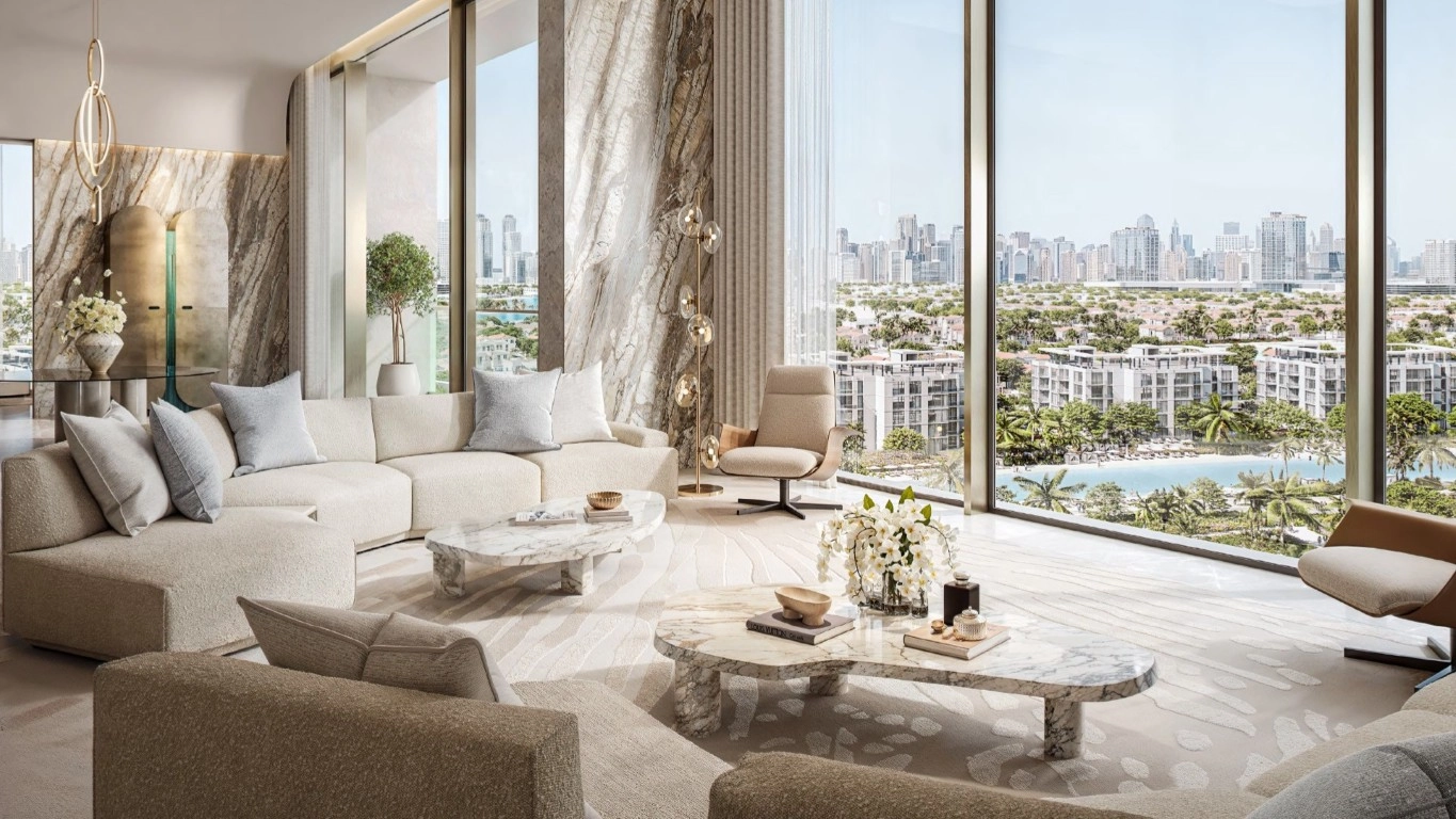 One-bedroom apartments start at about 740 square feet and can exceed 4,500 square feet for four-bedroom units, topped by a five-bedroom penthouse. Open kitchens connect to bright living rooms that lead to spacious terraces, while larger homes offer smart controls, built-in storage, and maid's rooms.