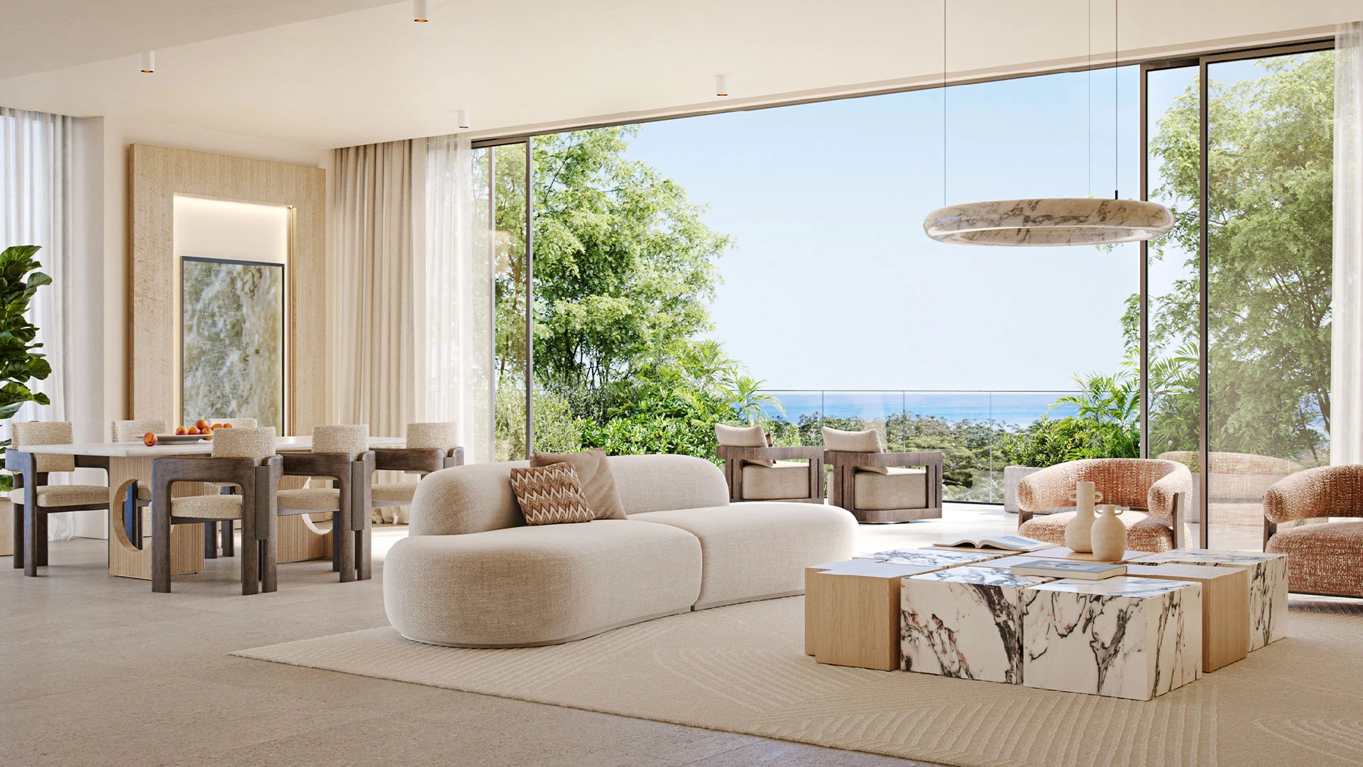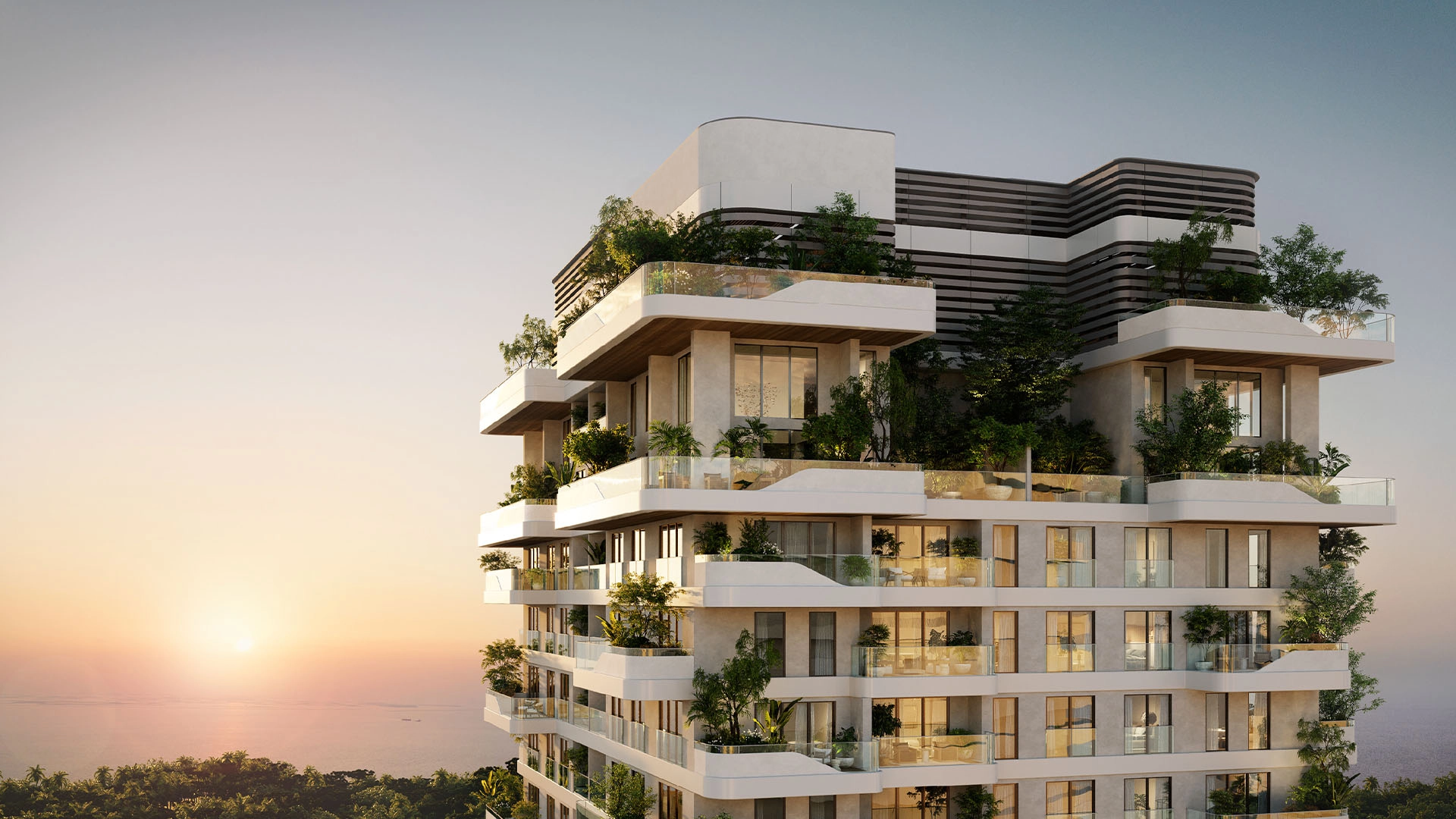 The architecture at Talea is inspired by nature, featuring beautiful leaf-like designs, shiny glass walls, warm stone accents, and sleek metal railings that dance with the light and reflect the sea. Spacious terraces and lush sky gardens invite outdoor living, while soft evening lights create a cozy ambiance along the coast. Inside, the tower offers a variety of homes ranging from one to four bedrooms, with sizes from 757 to a generous 4,462 square feet. Open kitchens flow seamlessly into bright living areas with floor-to-ceiling windows, and each home includes its own private garden terrace or balcony, a sparkling pool, smart climate control, and soothing natural tones.