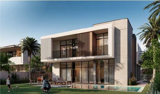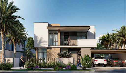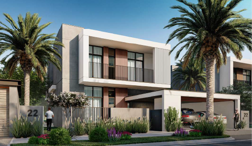 Modern two-storey villas boast white walls, wooden accents, and large windows for plenty of daylight. Each driveway fits three cars, and back gardens can include an optional pool.