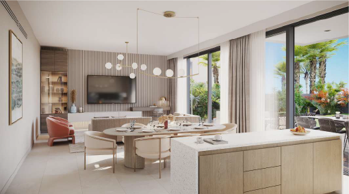 Amenities include large swimming pools, children's pools, courts for padel, tennis, and basketball, as well as green lawns for picnics. The community features shaded playgrounds, jogging tracks, a retail center, and bike paths to the Al Furjan Metro, all with 24/7 gated security.