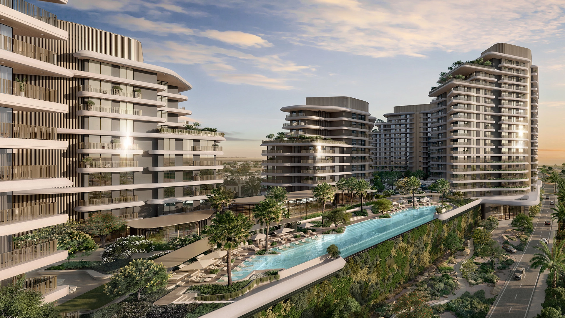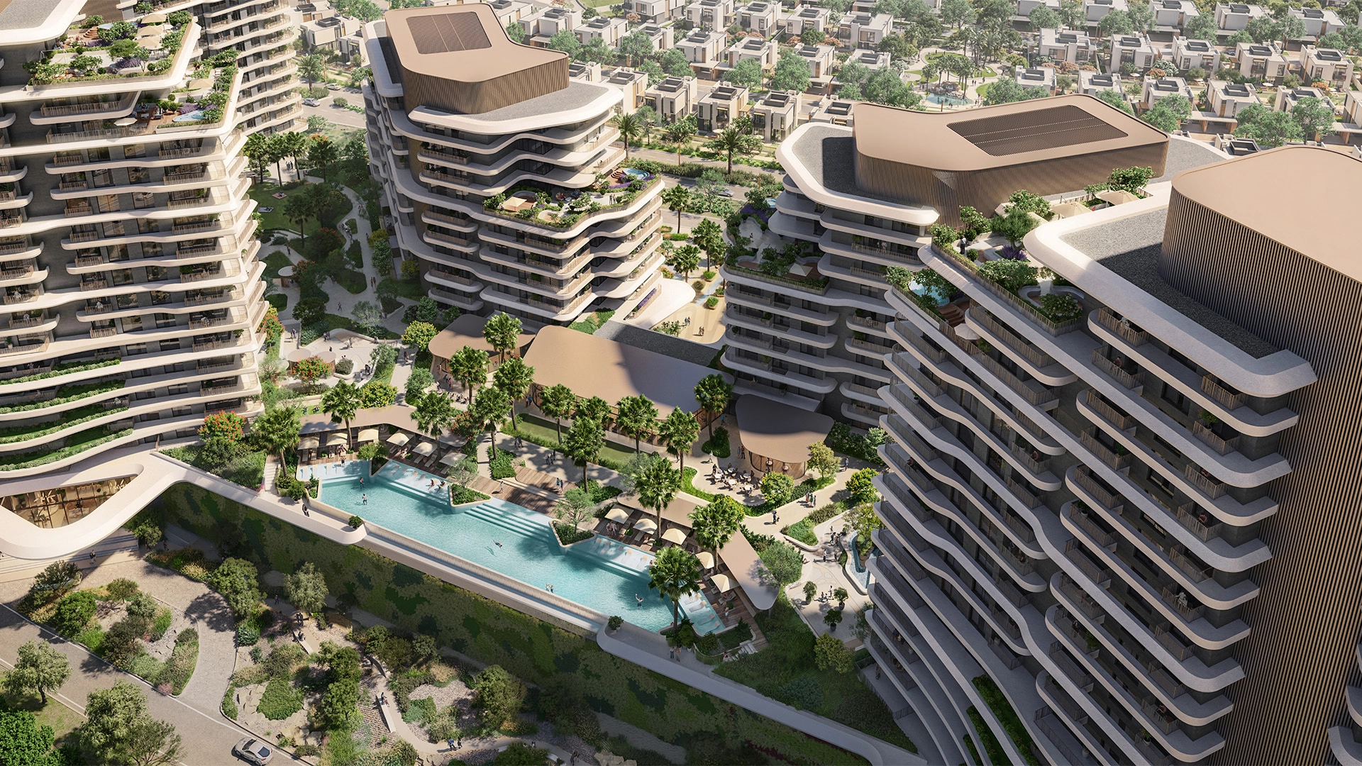 The program emphasizes wellness with an infinity pool, tree-shaded pavilions for yoga, and 24-hour gyms. Children have access to splash pools and a primary school, while adults enjoy coworking lounges, a clinic, cafés, and concierge services. Sustainability is prioritized with smart irrigation, EV chargers, and LEED Gold-standard design.