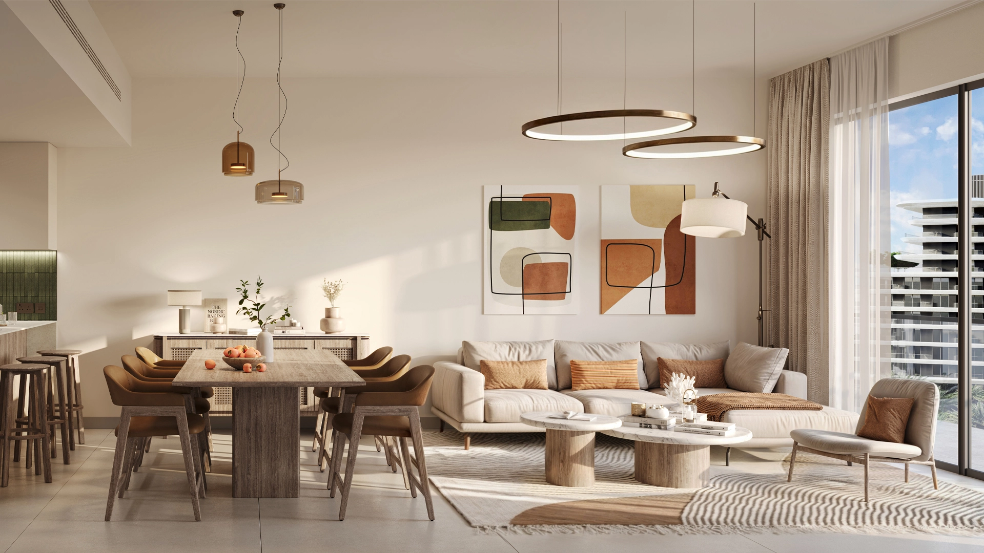 The residential options include 1-bedroom suites and 3-bedroom family apartments and duplexes. Open kitchens connect to living areas, and floor-to-ceiling windows bring in natural light. With calming earth tones, smart climate control, and built-in storage, these homes range from 730 to 1,690 square feet, and some feature balconies for outdoor dining.