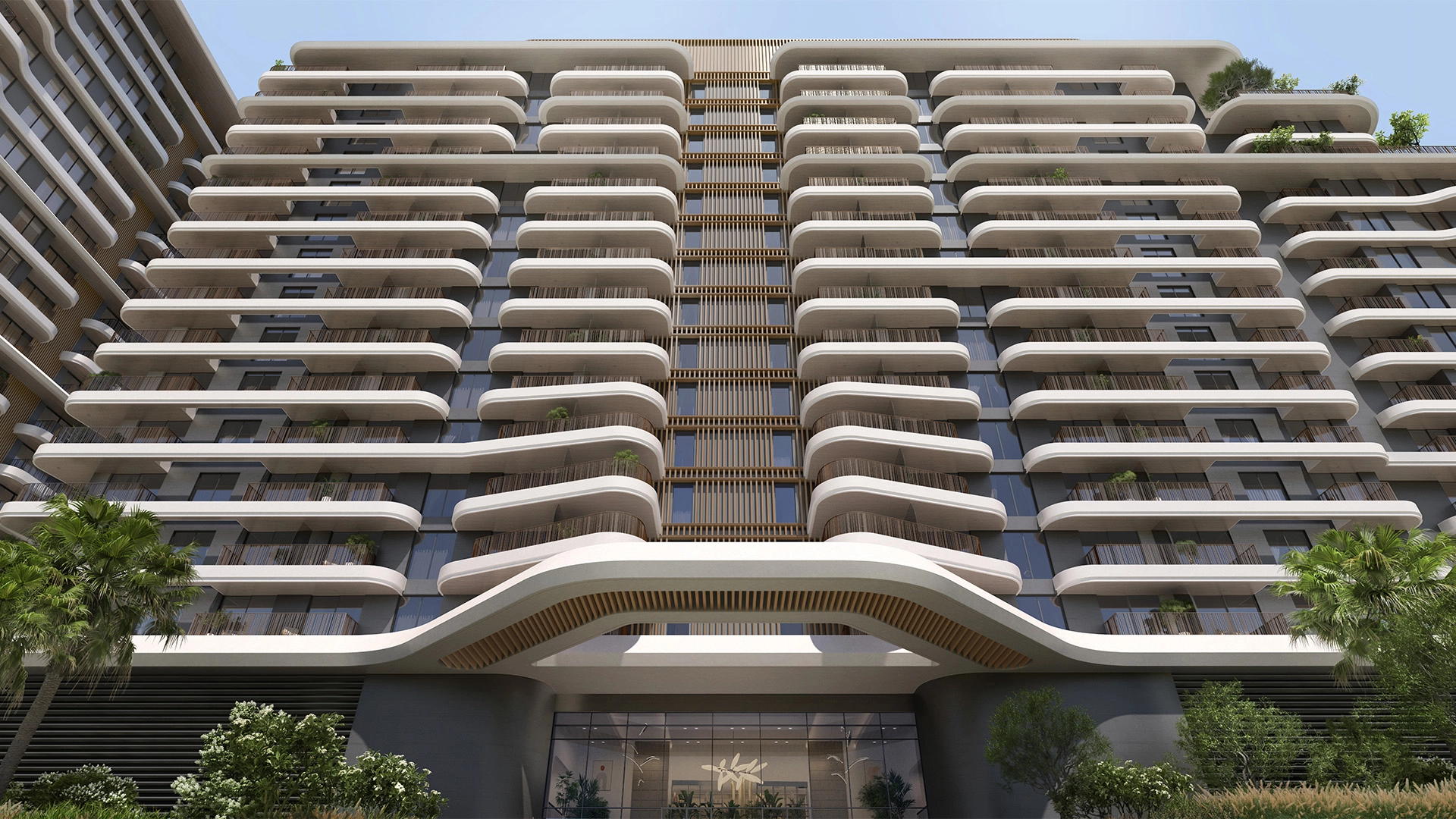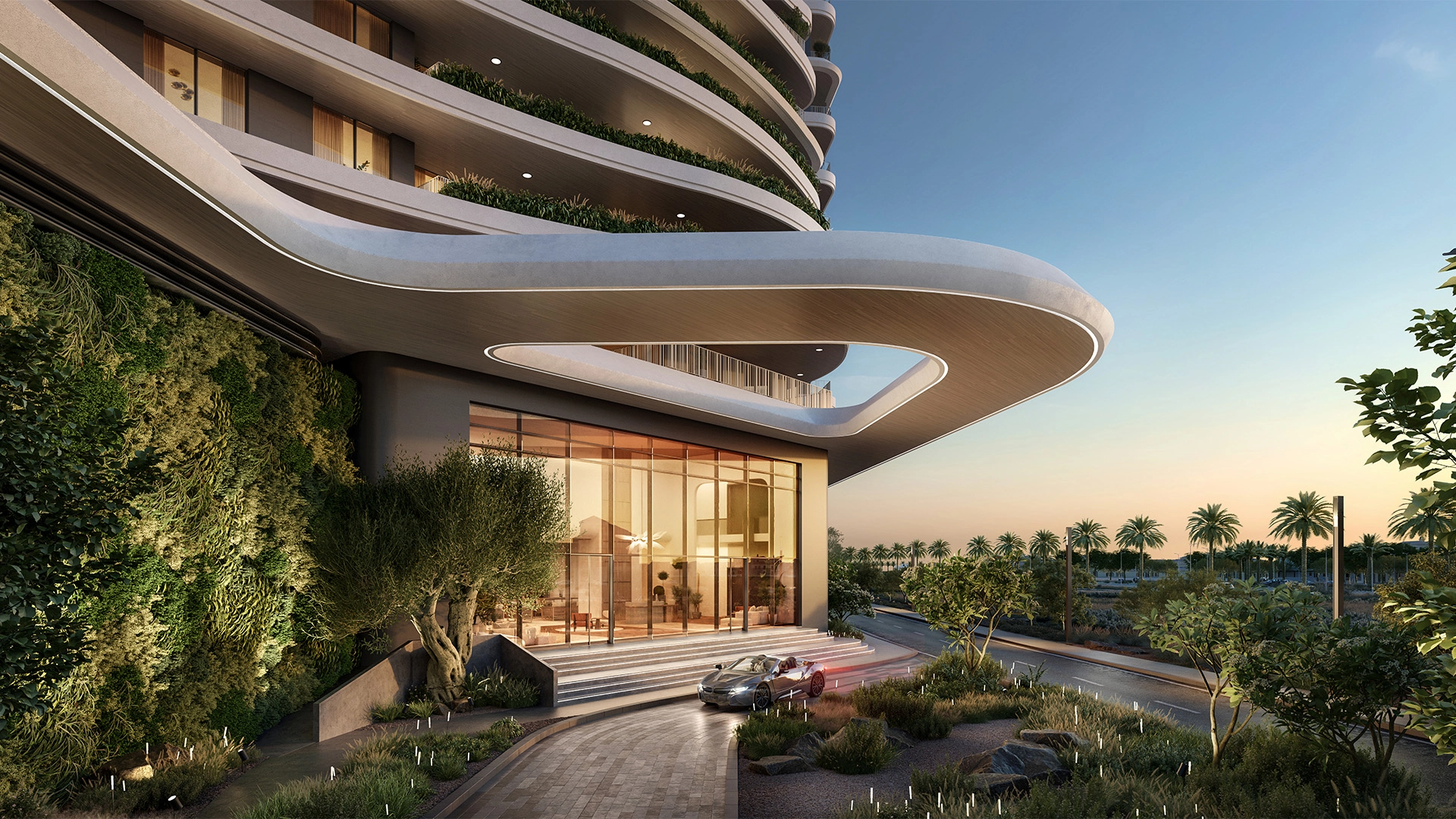 Exteriors showcase clean horizontal lines in pale stone and glass, accented by green balcony planters. Deep overhangs minimize glare, while soft night lighting casts a calming glow along the pathways.